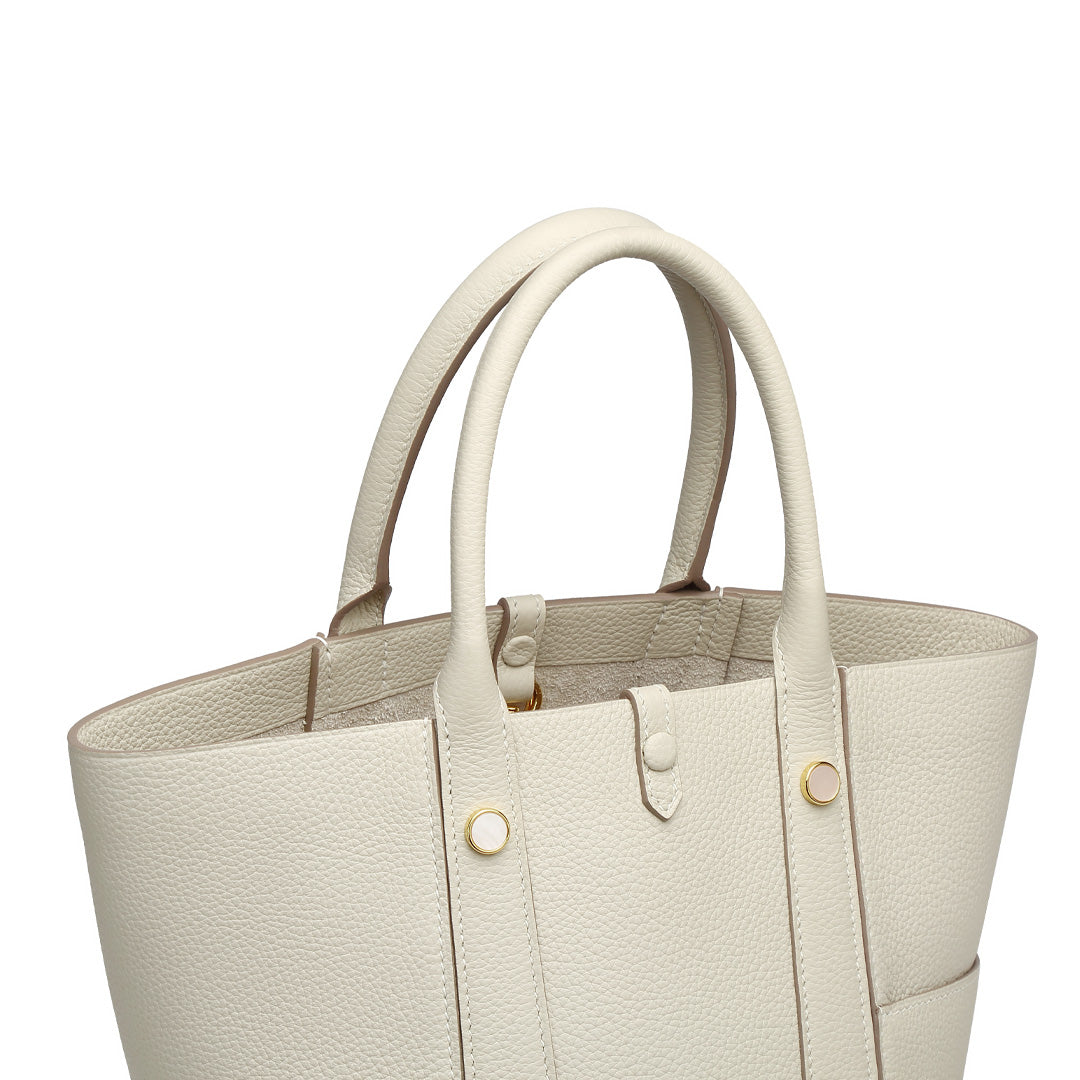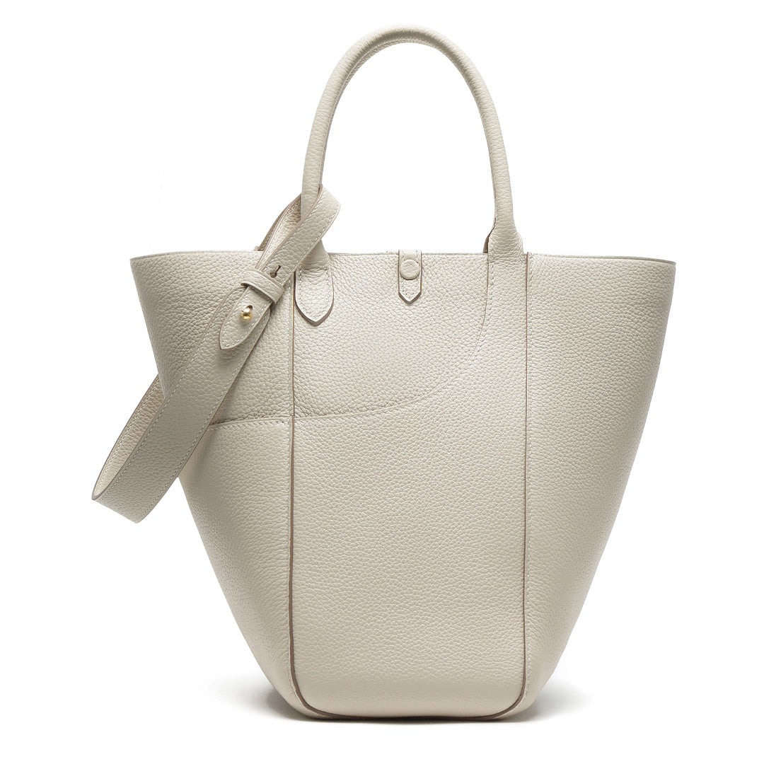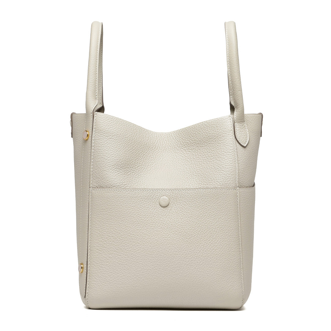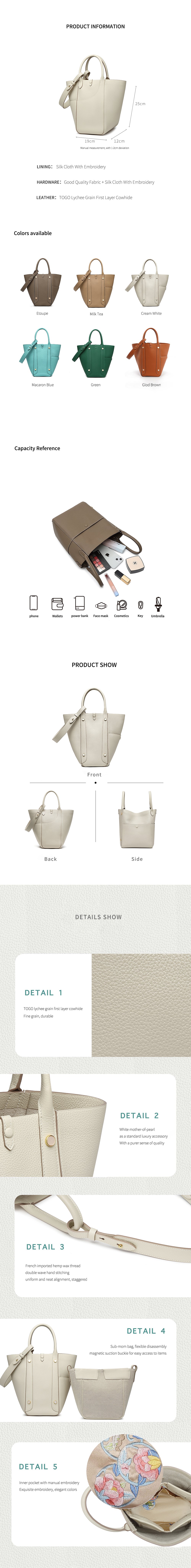 This multifunctional picotin bag is made of Togo lychee grain first layer cowhide, hand hemp wax thread stitching; the four sides of the bag are a unique design, enhancing its collocation; the outsourcing is directly exposed leather bottom, the feel of the leather is soft, fashionable and casual; the mouth of the bag is made of paste leather design, oil edge is not easy to crack. The wrist shape is inspired by the oriental wedding dress of the phoenix crown and cape shape; the magnetic closure inside the bag is removable, and the interior is manually embroidered. The entire bag is available in Etoupe, Macaron Blue, Green, White, Brown, suitable for a variety of occasions.