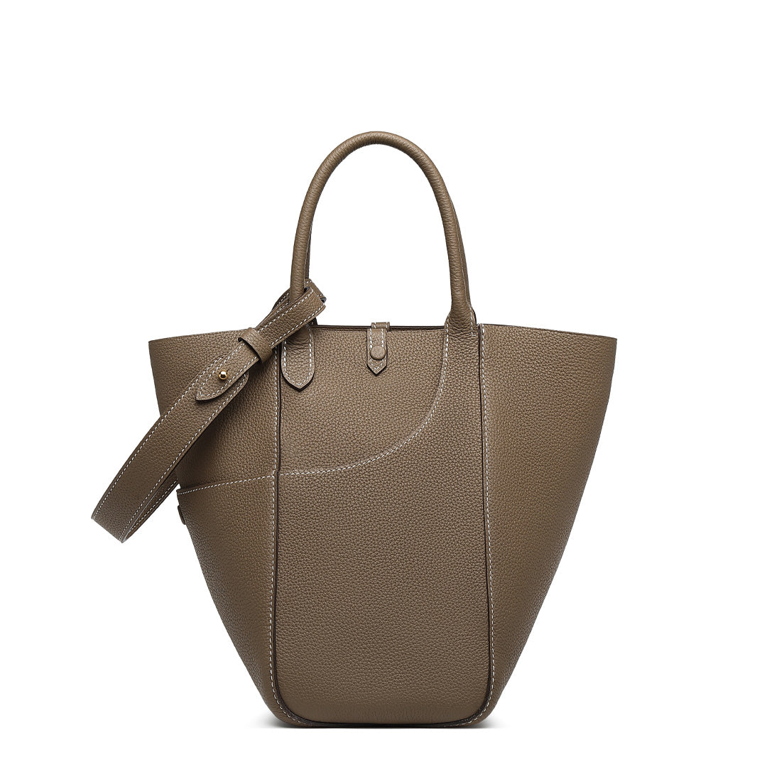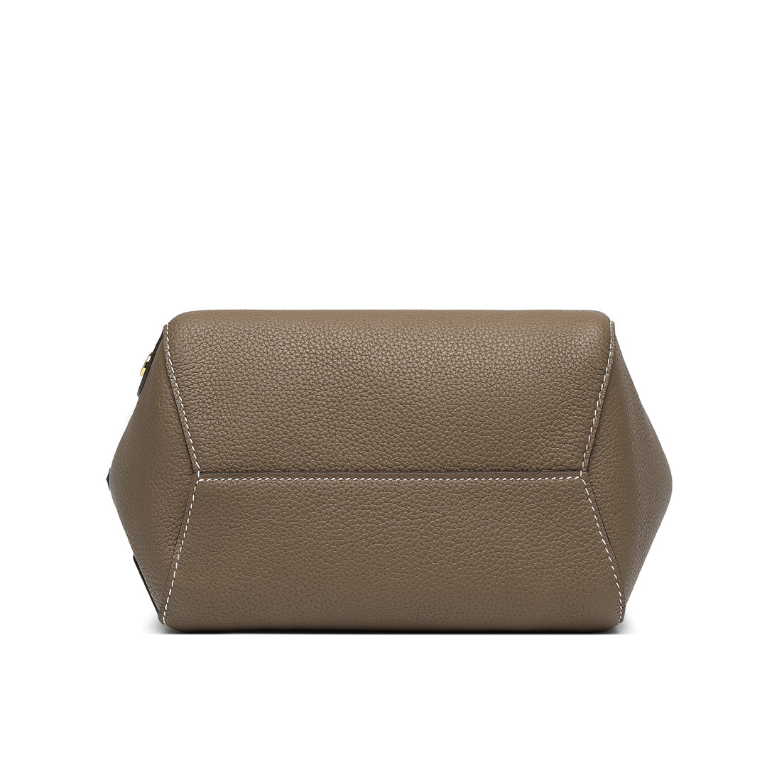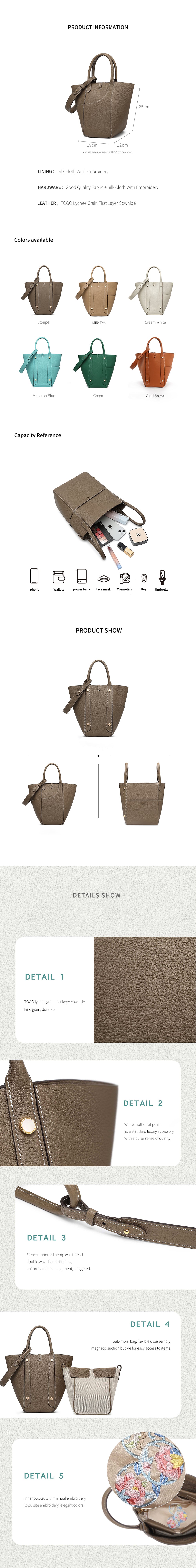 This multifunctional picotin bag is made of Togo lychee grain first layer cowhide, hand hemp wax thread stitching; the four sides of the bag are a unique design, enhancing its collocation; the outsourcing is directly exposed leather bottom, the feel of the leather is soft, fashionable and casual; the mouth of the bag is made of paste leather design, oil edge is not easy to crack. The wrist shape is inspired by the oriental wedding dress of the phoenix crown and cape shape; the magnetic closure inside the bag is removable, and the interior is manually embroidered. The entire bag is available in Dark Gray, Macaron Blue, Green, White, Brown, suitable for a variety of occasions.