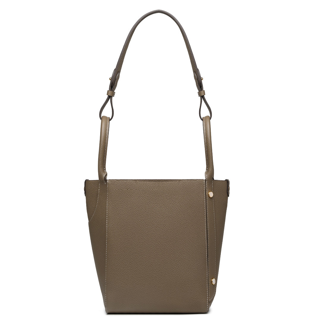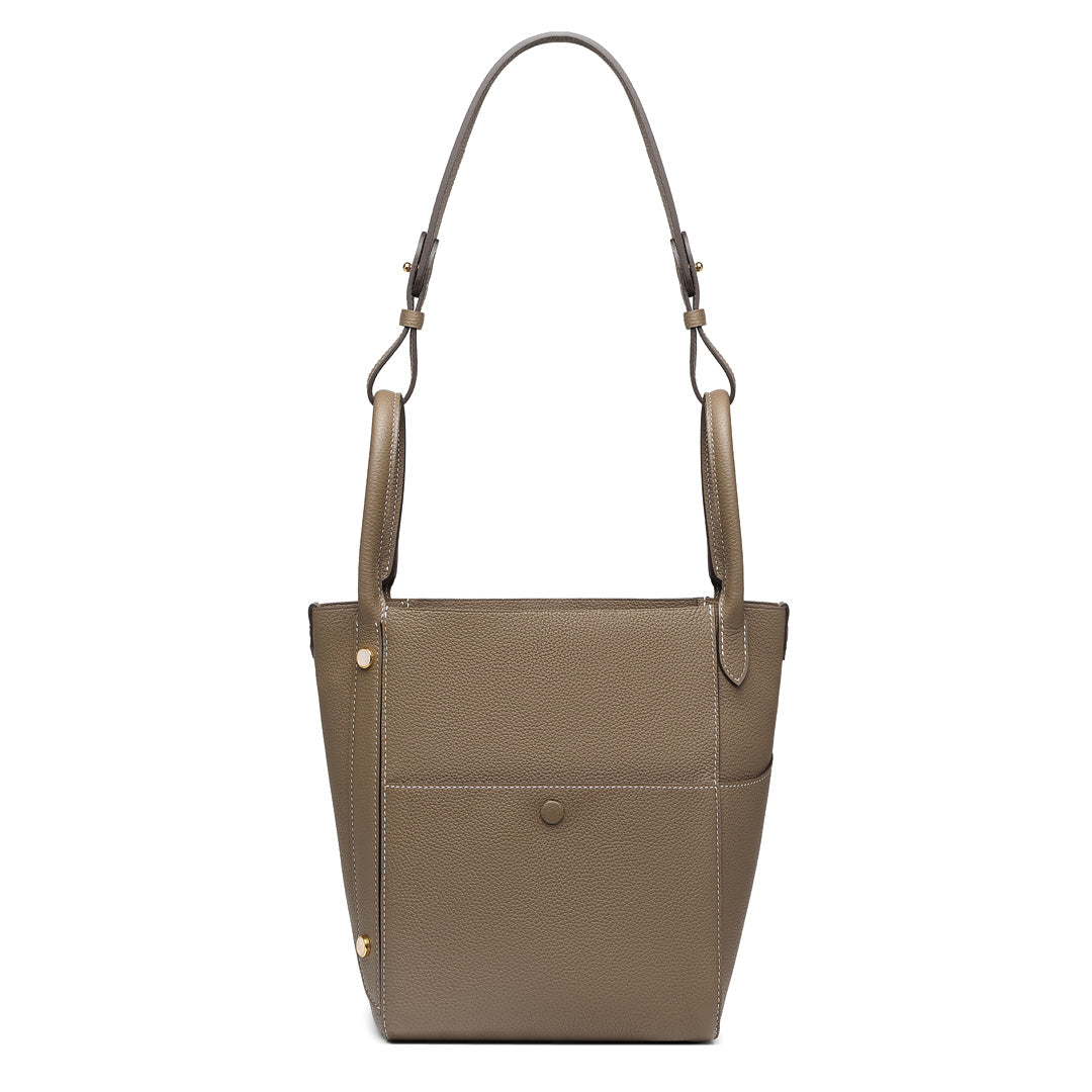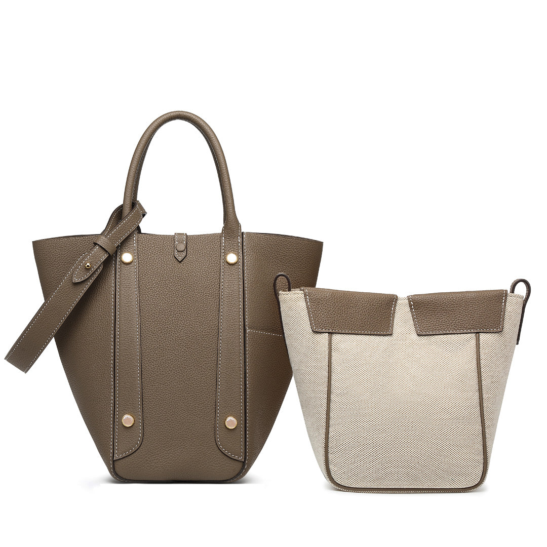 This multifunctional picotin bag is made of Togo lychee grain first layer cowhide, hand hemp wax thread stitching; the four sides of the bag are a unique design, enhancing its collocation; the outsourcing is directly exposed leather bottom, the feel of the leather is soft, fashionable and casual; the mouth of the bag is made of paste leather design, oil edge is not easy to crack. The wrist shape is inspired by the oriental wedding dress of the phoenix crown and cape shape; the magnetic closure inside the bag is removable, and the interior is manually embroidered. The entire bag is available in Dark Gray, Macaron Blue, Green, White, Brown, suitable for a variety of occasions.